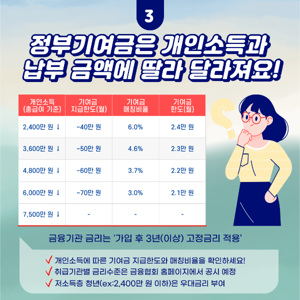 이전에 출시한 청년희망적금에 비해 소득 요건을 완화했다고 해요.